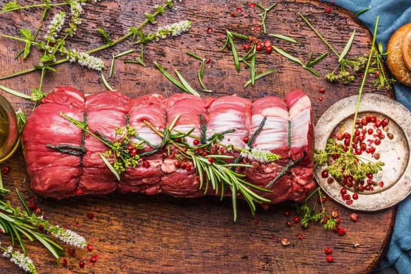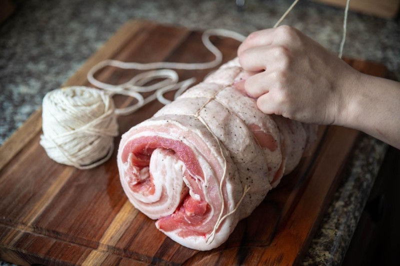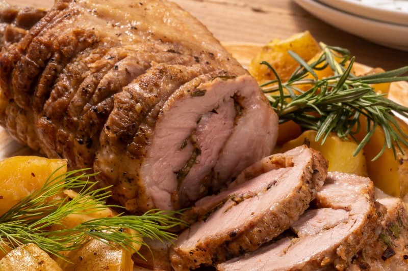 イタリア風ローストポークは、豚肩肉を薄く開き、オリジナルスパイスで味付けを行いタコ糸でしばり味付けを行って、1日マリネしてから焼き上げております。